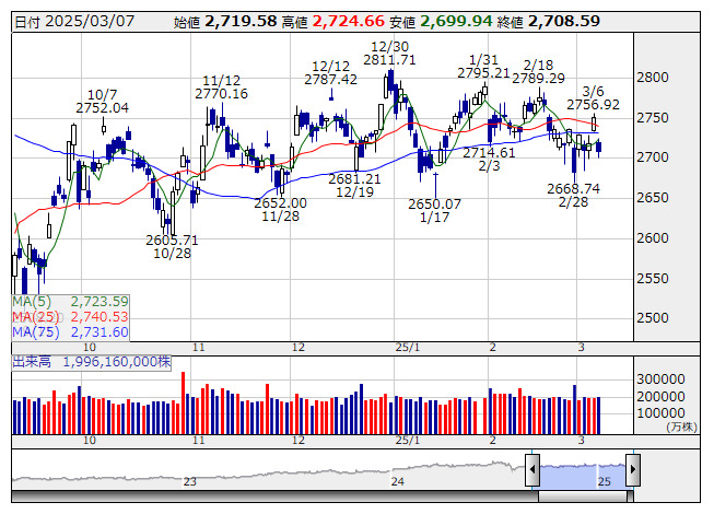 2025年03月10日08時46分 【市況】TOPIX先物:10日寄り付き=6.5ポイント高、2712ポイント TOPIX <日足> 「株探」多機能チャートより 10日8時45分、TOPIX先物期近2025年3月限は前週末清算値比6.5ポイント高の2712ポイントで寄り付いた。前週末のTOPIXの現物終値2708.59ポイントに対しては3.41ポイント高。 株探ニュース
