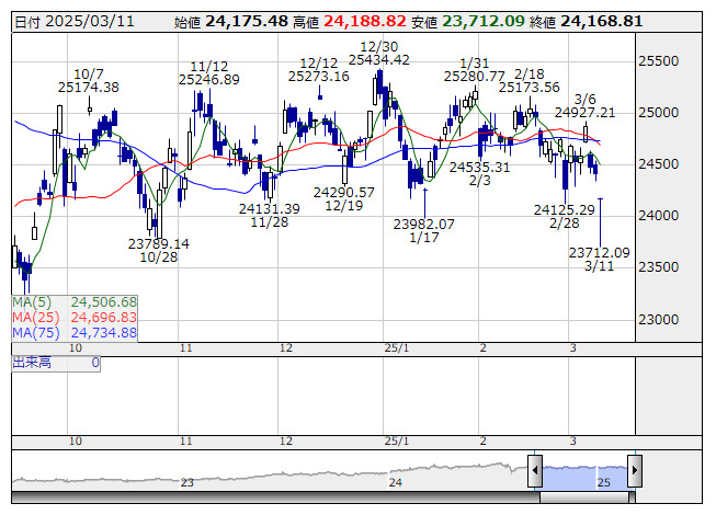 2025年03月12日08時46分 【市況】JPX日経400先物:12日寄り付き=85ポイント安、2万4085ポイント JPX日経400 <日足> 「株探」多機能チャートより 12日8時45分、JPX日経インデックス400先物期近2025年3月限は前日清算値比85ポイント安の2万4085ポイントで寄り付いた。前日のJPX日経インデックス400の現物終値2万4168.81ポイントに対しては83.81ポイント安。 株探ニュース