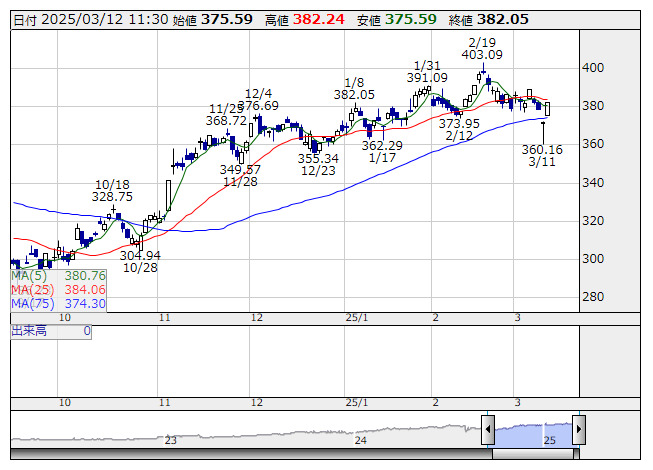 銀行業 <日足> 「株探」多機能チャートより●東証33業種 値上がり: 26 業種 値下がり: 7 業種