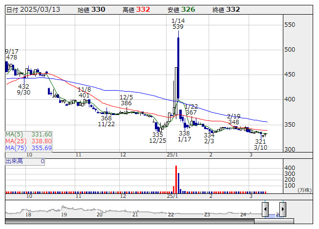 ストップ高買い気配。国土交通省中部地方整備局が公募した現場ニーズ「道路異常箇所の自動抽出・事故損傷箇所を判別する技術」に対する技術提案が採用されたと発表し、好材料視されている。現場ニーズと技術シーズのマッチングは建設現場の生産性向上や課題解決を目的とした国土交通省の取り組みで、今回マッチングした2つの技術の現場試行を25年4月から実施、実用化に向けた検証を行い、技術の課題や改善点を洗い出し、改良を重ね国土交通省の新技術情報提供システム「NETIS」への登録を目指すとしている。