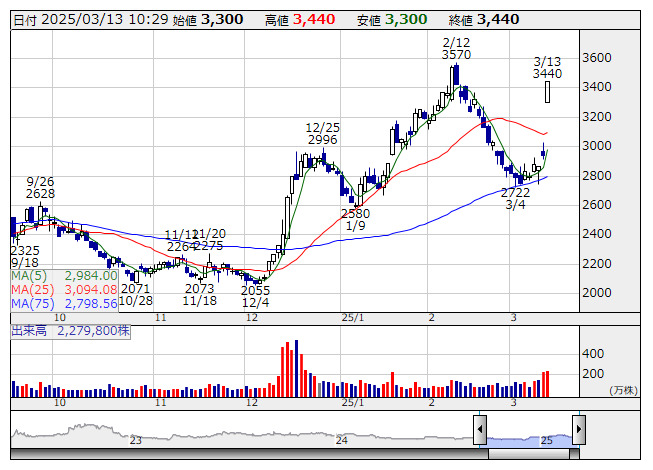 5032>はストップ高。前日に第3四半期の決算を発表、累計営業利益は110億円で前年同期比21.3%増となり、通期予想は従来の148億円から154億円、前期比24.6%増に上方修正している。VTuberグループ「にじさんじ」において、コマース領域およびプロモーション領域を中心に想定を上回る業績進捗となっているもよう。上半期は67.6億円で前年同期比4.3%増にとどまっていたことから、上方修正にはインパクトが強まっているようだ。
