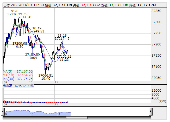 日経平均 <1分足> 「株探」多機能チャートよりきょう前場の東京株式市場は前日の米国株市場でハイテク株比率の高いナスダック総合株価指数が大きく上昇したことを受けリスクオンの地合いとなった。日経平均は高く始まった後、次第高の展開で一時500円を超える上昇をみせる場面もあった。防衛関連や半導体関連などに幅広く物色の矛先が向き、全体指数を押し上げている。途中急速に伸び悩む場面もあったが、前引けにかけて買い直され350円あまりの上昇で着地している。値上がり銘柄数は全体の68%を占めたが、全体売買代金は2兆円強とやや盛り上がりを欠いている。