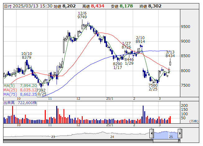 トヨタ自動車<7203>やホンダ<7267>など自動車株が軟調に推移。時事通信によると、トランプ米大統領は12日、ホワイトハウスで記者団に対し「日本(からの自動車輸入の規模)はあまりに大き過ぎる」などと述べ、日本の自動車貿易を改めて批判した。米国側は4月2日に相互関税を発表するとみられている。米政権の関税策の方向性にマーケットの関心が向かうなか、トランプ氏の今回の発言を受け、自動車株に対しては稼ぎ頭となる北米事業の先行きを懸念した売りが膨らんだようだ。