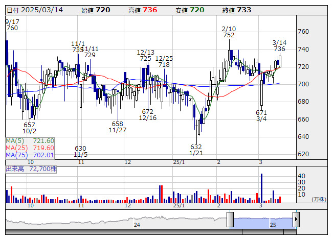1月28日につけた244円を戻り高値に、200日線に上値を抑えられる形での調整となり、25日、75日線を下抜けていた。ただし、1月30日につけた214円をボトムにリバウンド基調を継続し、直近では25日線を支持線に、75日線を上抜けてきた。1月の下落局面で空けたマドを埋めてきており、一段のリバウンドが期待されそうである。