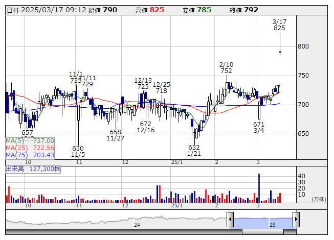 5248>がカイ気配スタート。同社は遊技機向け映像ソフトウェアの開発を主軸としていたが、23年7月に実施したM&Aによって業態転換し、現在は太陽光発電設備など再生エネルギー事業が収益の柱を担っている。業績は大幅な増収増益基調が続いており、前週末14日に発表した25年1月期決算は、売上高が前の期比95%増の139億円、営業利益が同99%増の17億3800万円と過去最高を大幅に更新した。続く26年1月期は売上高が前期比43%増の199億3500万円、営業利益は同47%増の25億5800万円と高成長が続く見通し。これを好感する買いを呼び込んでいる。