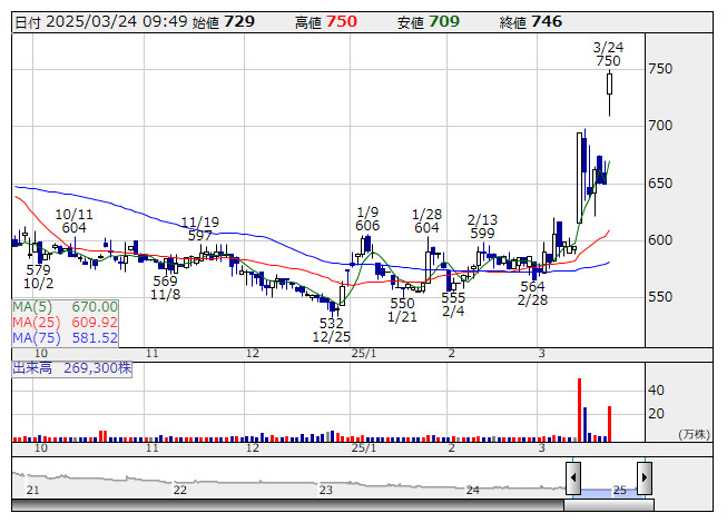 2025年03月24日09時48分 【材料】バリオ急伸、光通信が大量保有 バリオ <日足> 「株探」多機能チャートより バリオセキュア<4494>は急伸。光通信<9435>のグループ会社が21日付で関東財務局に提出した大量保有報告書で、バリオ株の保有割合が5.34%と新たに5%を超えたことが判明。これを受けて思惑的な買いが入っている。 保有目的は「純投資」。報告義務発生日は3月13日。 出所:MINKABU PRESS