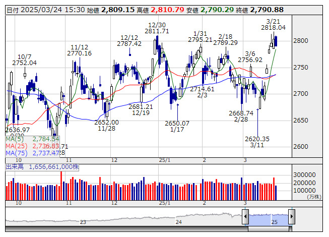 2025年03月24日15時47分 【市況】TOPIX先物:24日清算値=16ポイント安、2761.5ポイント TOPIX <日足> 「株探」多機能チャートより 24日15時45分、TOPIX先物期近2025年6月限は前週末清算値比16ポイント安の2761.5ポイントで取引を終えた。出来高は4万3130枚だった。この日のTOPIXの現物終値2790.88ポイントに対しては29.38ポイント安。 株探ニュース
