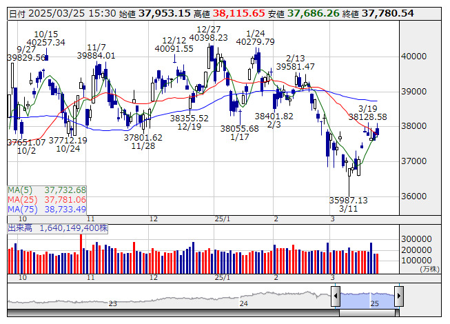 日経平均 <日足> 「株探」多機能チャートより日本取引所が公表した先物手口情報によると、3月25日の日経225ミニ期近(2025年4月限)の夜間取引(立会内・J-NETの合算)で、取引高トップはABNクリアリン証券の5156枚だった。