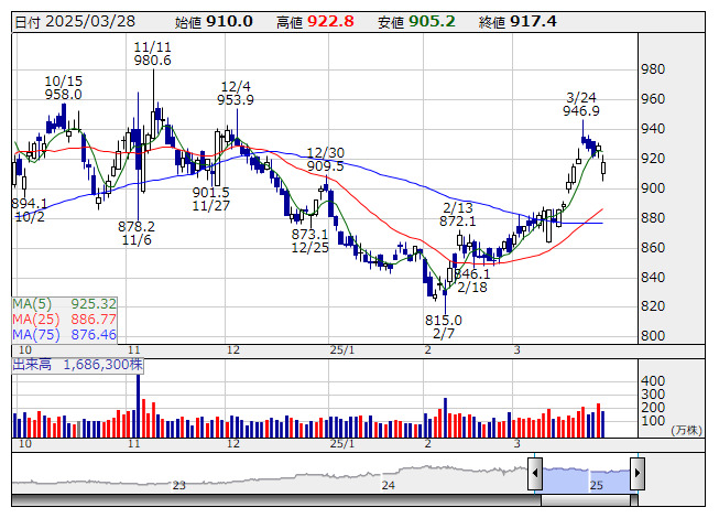 ニッスイ <日足> 「株探」多機能チャートより(東証プライム上場 1634 銘柄対象)