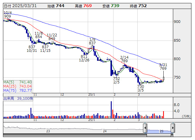 フェリシモ <日足> 「株探」多機能チャートより銘柄名<コード>31日終値⇒前日比