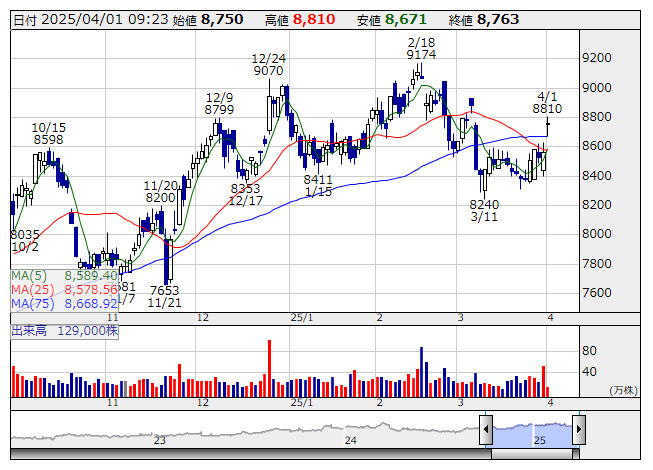 しまむら <日足> 「株探」多機能チャートより今期の売上高予想は前期比4.1%増の6926億4000万円とした。グループ全体で52店舗の新規出店と19店舗の閉店を予定する。既存店売上高の伸長とともに商品力・販売力の強化を図り、収益拡大につなげる。25年2月期の売上高は前の期比4.8%増の6653億5800万円、最終利益は同4.5%増の418億8500万円だった。