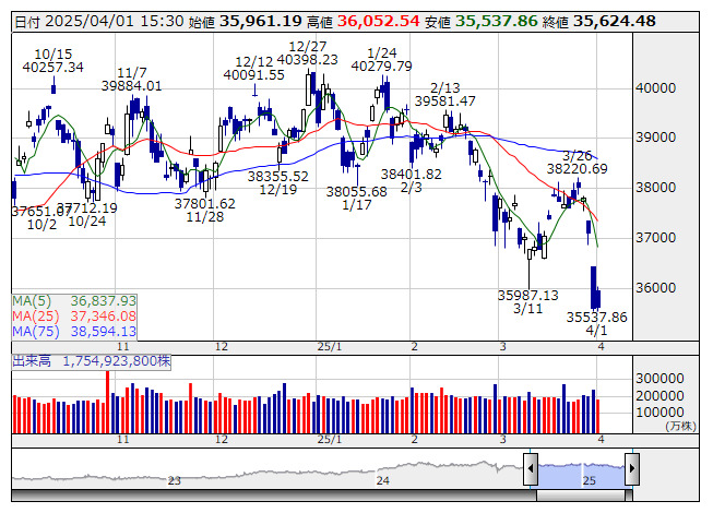 日経平均 <日足> 「株探」多機能チャートより日本取引所が公表した先物手口情報によると、4月1日の日経225ミニ期近(2025年4月限)の夜間取引(立会内・J-NETの合算)で、取引高トップはABNクリアリン証券の8820枚だった。
