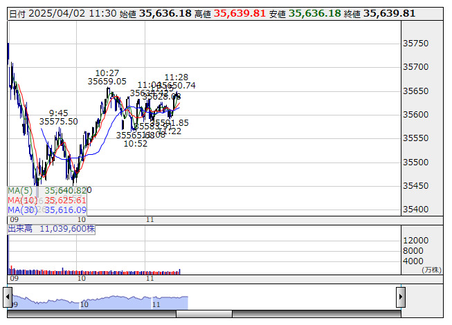 日経平均 <1分足> 「株探」多機能チャートよりきょう前場の東京株式市場は売り買い交錯のなか、前日終値を挟み方向感なくもみ合ったが、前引けは小幅ながらプラス圏で着地している。トランプ米政権による「相互関税」が日本時間あすの早朝に詳細が明らかとなる見通しにあり、この内容を見極めたいとの思惑から見送りムードが強い。日経平均は小幅続伸して引けたものの、銀行株などが安くTOPIXは反落している。値下がり銘柄数は1200を上回り、プライム市場全体の74%を占めた。売買代金は1兆7000億円台と低調だった。