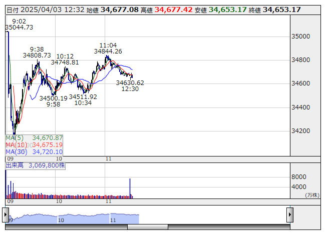 2025年04月03日12時31分 【市況】東京株式(後場寄り付き)=日経平均株価は前場終値比でもみ合い 日経平均 <1分足> 「株探」多機能チャートより 後場寄り付き直後の東京株式市場では、日経平均株価が前営業日比1070円安前後と前場終値と比較してもみ合い。外国為替市場では1ドル=147円50銭近辺の推移。アジアの主要株式市場は高安まちまち。 出所:MINKABU PRESS
