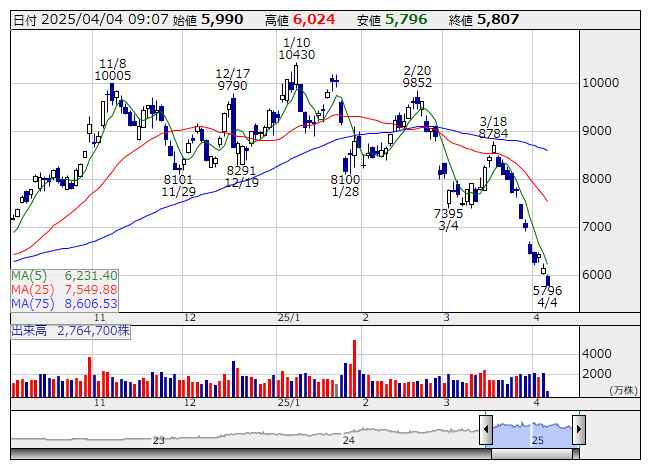 MU>は16%を超える急落となっている。フィラデルフィア半導体株指数(SOX指数)は10%近い記録的な下げとなっており、東京市場でもこの流れを引き継ぎ半導体セクターに向かい風が強い。アドテストは昨年9月中旬以来、約7カ月ぶりの6000円大台割れを余儀なくされている。
