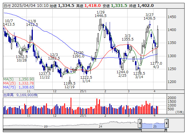8801>が急騰している。トランプ米政権の相互関税発表で世界的にリスク回避ムードが強まり、全体相場は調整を余儀なくされている。一方で、安全資産と位置付けられる債券への資金流入は内外金利の低下をもたらし、円高の進行を背景に日銀の追加利上げ観測は後退した。金利上昇による借り入れ負担の増加は不動産セクターには重荷となると一般的に解釈されているが、足もとでの金利低下を受け業績安定感のある大型不動産株に見直し買いが入ったようだ。1日に日銀が公表した3月の全国企業短期経済観測調査(短観)で、大企業の不動産の業況判断DIがプラス59と高水準にあることも、事業環境の良好ぶりを投資家に印象付けており、物色意欲を高める方向に作用した。三菱地所<