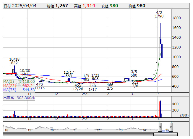 イオレ <日足> 「株探」多機能チャートより■イオレ <2334> 980円 (-300円、-23.4%) ストップ安