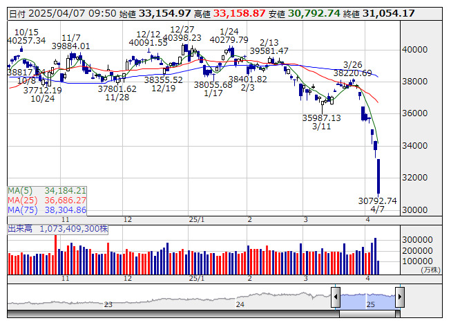 1570>は朝方から大量の売り注文に商いが成立しないまま気配値を切り下げ、取引開始後24分を経過したところでようやく寄り付く、前例に乏しいリスクオフ一色の展開となった。寄り付いた直後に前日比18%安の1万6565円まで売り込まれる場面があった。日経レバは日経平均株価に連動する仕組みで組成されたETFで、価格変動率が日経平均の2倍に基本設定されていることから全体相場のボラティリティが高まる場面では、個人投資家など短期筋の商いが活発化する傾向が強い。前週末の欧米株市場がトランプ関税の世界経済への影響を懸念して全面安となるなか、東京市場でもリスク回避目的の売りが噴出した。日経平均は一時9%近い下げで3万1000円台を割り込んでおり、昨年8月5日のザラ場につけた3万1156円の安値を下回った。信用で買い建てた投資家の追い証に絡む投げ売りも下げを助長しているもようだ。