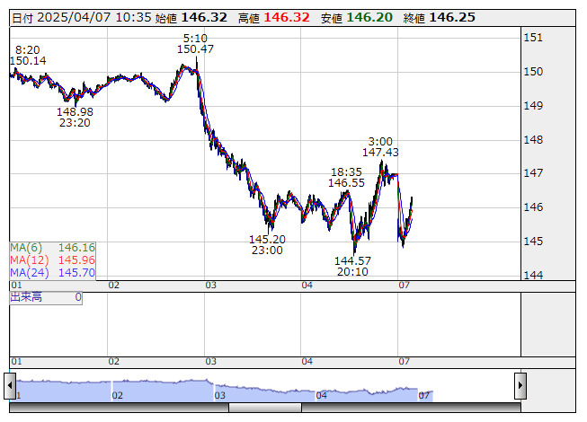 2025年04月07日10時37分 【通貨】東京為替:ドル・円は146円27銭まで戻す 米ドル/円 <5分足> 「株探」多機能チャートより 7日午前の東京市場で米ドル・円は146円10銭台で推移。一時144円82銭まで反落したが、146円27銭まで反発。ユーロ・ドルは反発。1.0882ドルから1.1000ドルまで反発。ユーロ・円は反発、158円30銭から160円43銭まで反発。 《MK》 提供:フィスコ