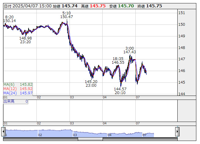 2025年04月07日15時01分 【通貨】外為:1ドル145円74銭前後と大幅なドル安・円高で推移 米ドル/円 <5分足> 「株探」多機能チャートより 7日の外国為替市場のドル円相場は午後3時時点で1ドル=145円74銭前後と、前週末午後5時時点に比べ53銭の大幅なドル安・円高。ユーロ円は1ユーロ=160円60銭前後と36銭のユーロ安・円高で推移している。 株探ニュース