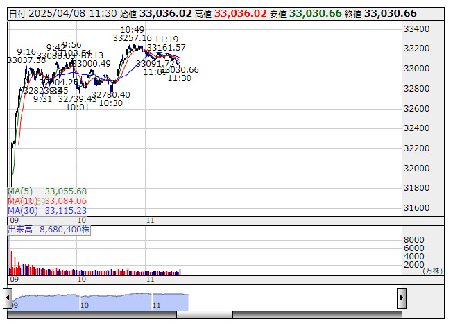 日経平均 <1分足> 「株探」多機能チャートよりきょう前場の東京株式市場はリスクオフの巻き戻し局面に移行、日経平均株価は急反騰に転じた。一時は2000円を超える上昇で前日の下げ分の8割近くを取り返す格好となった。前日の米国株市場ではNYダウは乱高下の後、結局3日続落で引けたが、ハイテク株比率の高いナスダック総合株価指数は小幅ながら反発したことから、投資家の過度な不安心理が後退した。前日とは真逆の展開でプライム市場の99%を超える銘柄が上昇している。売買代金上位100銘柄のうち、マイナス圏で引けたのはわずか1銘柄にとどまっている。