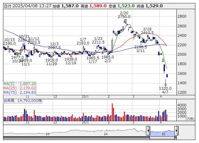 ルネサス <日足> 「株探」多機能チャートよりルネサスは半導体大手の一角で自動車向けマイコンでは世界首位級の商品競争力を持つ。業績は24年12月期に大幅減益を強いられたものの、足もとで在庫調整圧力が一巡し25年12月期以降は回復色をみせることが期待される。きょうは前日の米半導体株の上昇を受け、リバウンド狙いの買いが優勢となっている。ただ、前日までの3営業日合計で650円近い下げを示しており、きょうのところは自律反発に過ぎない印象だ。株価はここ下落する過程で連日マドを開け、リバウンド局面でもきょうはカイ気配で始まるなど荒い値動きとなっており、追撃買いにやや慎重なムードも漂っている。