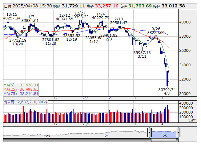 日経平均 <日足> 「株探」多機能チャートより日本取引所が公表した先物手口情報によると、4月8日の日経225ミニ期近(2025年4月限)の夜間取引(立会内・J-NETの合算)で、取引高トップはABNクリアリン証券の6万8312枚だった。