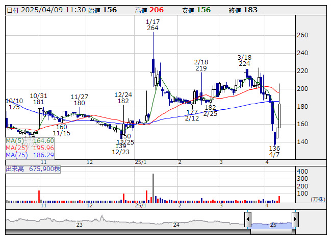 一方、インタースペース<2122>、エヌアイデイ<2349>、カワサキ<3045>、IACEトラベル<343A>、大和コンピューター<3816>など30銘柄が年初来安値を更新。放電精密加工研究所<6469>、メタプラネット<3350>、三ッ星<5820>、fonfun<2323>、まんだらけ<2652>は値下がり率上位に売られた。