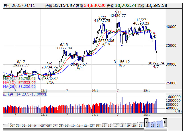 【↓】 4月 7日(月)―― 急落、米関税リスクを警戒し一時3万円トビ台