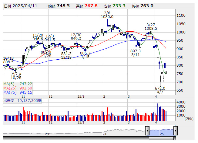 野村 <日足> 「株探」多機能チャートより(東証プライム上場 1634 銘柄対象)