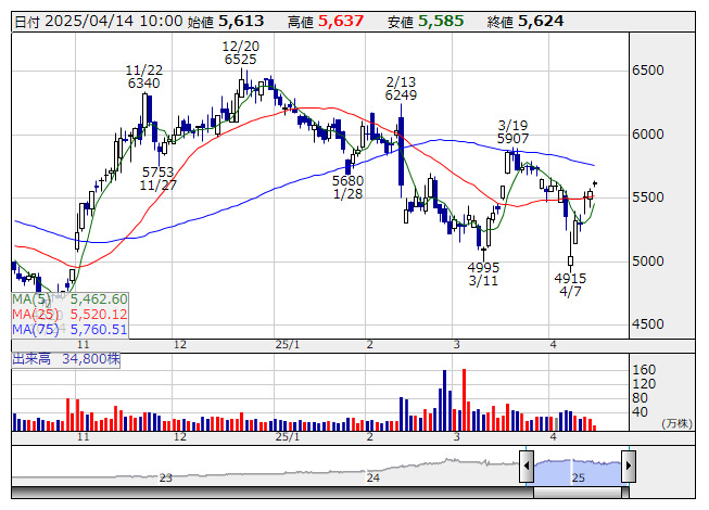 2025年04月14日10時00分 【材料】<注目銘柄>=高砂熱、高水準の空調関連需要が続く 高砂熱 <日足> 「株探」多機能チャートより 高砂熱学工業<1969>に注目したい。同社は空調工事のトップ企業。25年3月期連結純利益は前の期比21.9%増の239億円と最高益を更新する見込み。半導体関連を中心とする製造業や非製造業での需要は堅調で、受注高は拡大している。バブル期に建てられたオフィスビルなどが改修期に入っており、今後も高水準の空調関連の需要は続く見通しだ。26年3月期の同利益は260億円近辺への連続増益が見込める。 株価は昨年5月に6740円の最高値をつけた後は調整局面にあるが、今月7日の4915円前後は当面の底値圏となることが期待できる。好業績の内需関連株が見直されるなか、先行き6000円台回復後、再び最高値更新からの一段高を目指す展開が期待できる。(地和) 出所:MINKABU PRESS