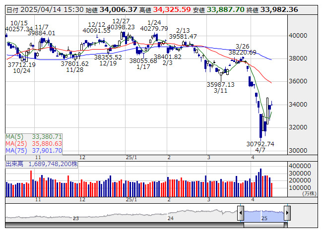 日経平均 <日足> 「株探」多機能チャートより日本取引所が公表した先物手口情報によると、4月14日の日経225ミニ期近(2025年5月限)の夜間取引(立会内・J-NETの合算)で、取引高トップはABNクリアリン証券の1万7398枚だった。