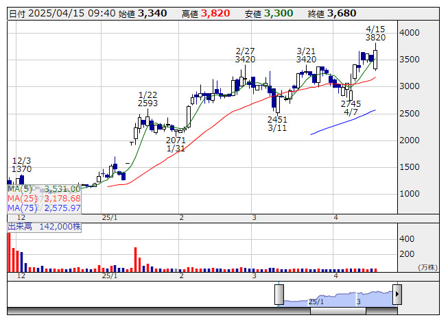 反発、年初来高値更新。25年8月期第2四半期(中間期)の売上高は16.54億円、経常利益は5.11億円となり、経常利益の通期計画6.3億円に対する進捗率は80%超と堅調に推移している。企業のCRE戦略へのニーズの高さや上場による認知度向上などの要因も相まって、全国の産業集積地を中心にCRE関連の案件パイプラインが継続的に積み上がっている。あわせて、新たに有効活用不動産のマスターリース事業・サブスクリプションサービスの管理システムの開発事業を開始すると発表し、好感されている。