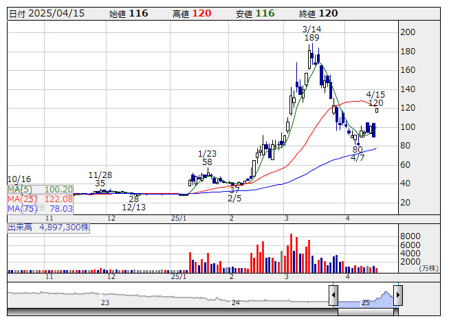 キッズウェル・バイオ <4584> [東証G]が急騰、一時ストップ高となった。同社は14日、子会社のS-Quatreが5月7~10日に米ルイジアナ州ニューオリンズで開催される「ISCT2025 国際細胞治療学会」で、SQ-SHED(乳歯歯髄幹細胞)の新たな大量培養法について米コーニング <GLW> と共同で発表することを明らかにしており、これが材料視されたようだ。なお、S-Quatreは、この新規大量培養法に基づき、今後の後期臨床試験及び商用製造への適用に向け、本格的なプロセス開発を行うため製造受託事業を展開するニプロ <8086> [東証P]と共同開発契約を締結し、開発を進めている。