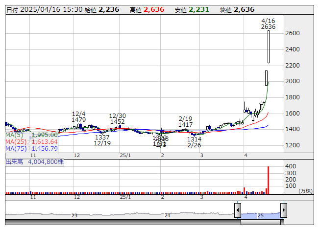GMOインターネット<4784>が20%を超える急騰で一時24.5%高の2510円まで駆け上がり、2000年9月に記録した上場来高値2095円(修正後株価)を大きく上回り、24年7カ月ぶりに青空圏に突入した。今年1月にグループ再編が行われ、親会社のGMOインターネットグループ<9449>からネットインフラ事業を承継したが、ネット広告事業とのシナジー発揮に伴う企業価値向上への思惑が株価を強く刺激している。収益も一変し、25年12月期は営業利益が80億円(前期実績は1億3900万円)を見込んでいる。中期的にも傾注する「GMO GPUクラウド」の本格稼働に伴う業績成長期待が買いの拠りどころとなっている。