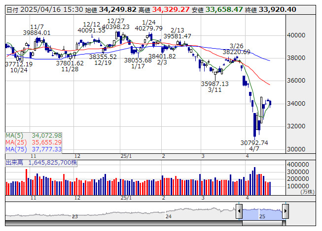 日経平均 <日足> 「株探」多機能チャートより日本取引所が公表した先物手口情報によると、4月16日の日経225ミニ期近(2025年5月限)の日中取引(立会内・J-NETの合算)で、取引高トップはソシエテG証券の5501枚だった。