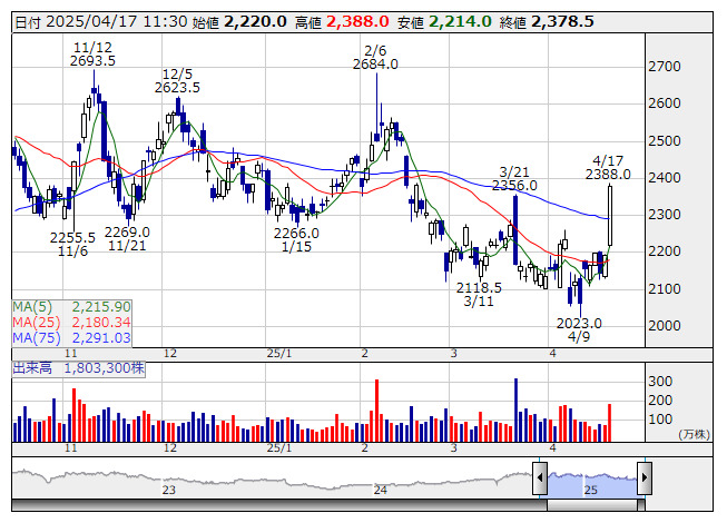 2371>が大幅高で底値圏から急浮上に転じている。大陽線を示現し、3月21日のザラ場につけた2356円の戻り高値を払拭しにわかに注目度が高まっている。同社が注力する「求人ボックス」事業が絶好調に推移しており、証券会社ではモルガン・スタンレーMUFG証券が同社株に強気評価(オーバーウェート)を示し、目標株価3000円を継続している。前日に観光庁が発表した1~3月期の訪日外国人観光客による消費額は、同期間としては過去最高となる2兆円を突破。訪日客数も1月以降の累計で過去最速で1000万人を超えたことで、インバウンド関連株への注目が改めて高まっているが、そのなか同社はインバウンド向けネット予約サービスを本格展開しており、収益環境への追い風が意識されている。