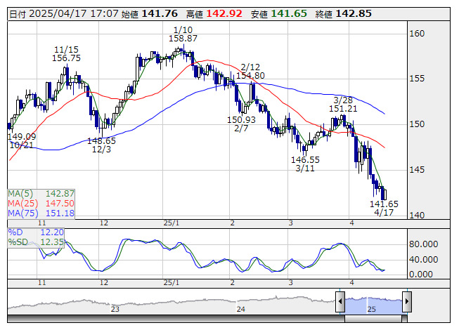 米ドル/円 <日足> Slowストキャス 「株探」多機能チャートより日本時間17日(米国時間16日)に日米関税協議が行われ、赤沢亮正経済再生担当相は協議後の記者会見で米側から関税交渉について日本との協議を最優先に進める意向を示されたことを明らかにするとともに、為替は議題に上らなかったと述べた。これを受けて同日の東京市場ではドル売り圧力が和らぎ、ドル円相場は142円台後半に上伸した。投資家心理が改善するなか、この流れを引き継ぐかたちで海外市場でもドル買い・円売りが続く可能性がある。
