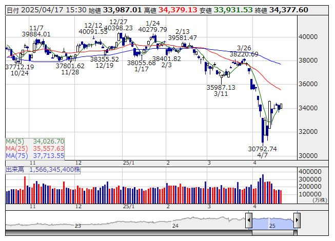 日経平均 <日足> 「株探」多機能チャートより日本取引所が公表した先物手口情報によると、4月17日の日経225ミニ期近(2025年5月限)の夜間取引(立会内・J-NETの合算)で、取引高トップはABNクリアリン証券の5622枚だった。