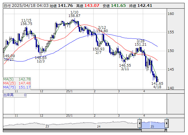 米ドル/円 <日足> 「株探」多機能チャートより17日のニューヨーク外為市場でドル・円は141円90銭まで下落後、142円72銭まで上昇し、引けた。