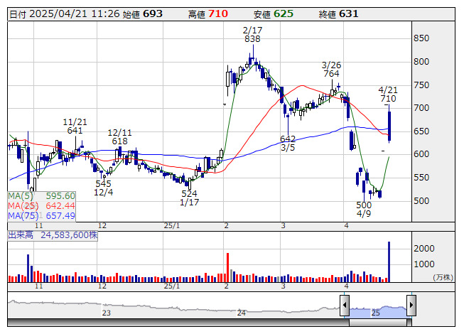 4506>は大幅反落。京都大学iPS細胞研究所などが、iPS細胞を使ったパーキンソン病の治験で安全性と有効性を示唆する結果を得たことから、その協力企業である同社への期待感が高まり、先週末にかけて連日のストップ高、39%の株価上昇となっていた。本日は短期的な過熱警戒感の高まりから、利益確定の動きが優勢になっているようだ。製造販売承認の申請がまだ先であるほか、今後予想される米国の医薬品関税の影響懸念なども拭えないとみられる。