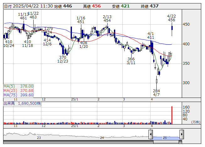 「25年3月期営業最高益に上方修正」と報じられた坪田ラボ <4890> や、マツモト <7901> は一時ストップ高まで買い進まれた。