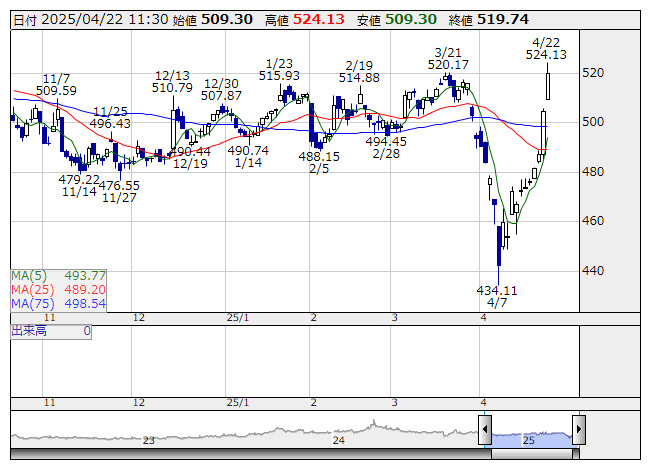 パルプ・紙 <日足> 「株探」多機能チャートより●東証33業種 値上がり: 26 業種 値下がり: 7 業種