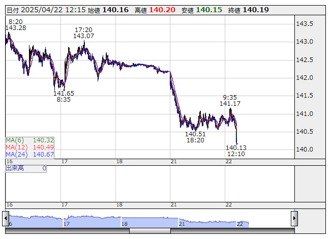米ドル/円 <5分足> 「株探」多機能チャートより22日午前の東京市場でドル・円は軟調地合いとなり、141円17銭から140円12銭まで1円超値を切り下げた。米連邦準備制度理事会(FRB)議長解任をめぐる問題でドルの信認低下による売りが強まったほか、円安是正の思惑も広がり、140円割れが視野に。