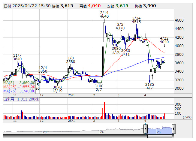 三井海洋 <日足> 「株探」多機能チャートより<6269> 三井海洋 3990 +375
