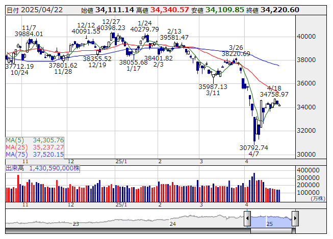 23日の東京株式市場は主力株をはじめ広範囲に買い戻す動きが優勢となり、日経平均株価は3日ぶりに大幅反発する展開が想定される。前日は日経平均が小幅に下げたものの値上がり銘柄数が全体の7割近くを占め、実際は中小型株を中心に買いの勢いが勝った。きょうは先物主導で大型株へのショートカバーを誘発し、日経平均が押し上げられそうだ。前日の欧州株市場ではドイツの主要株価指数であるDAXやフランスのCAC40などが取引前半はマイナス圏で推移したが、米株高を横目に終盤に上げ足を強めプラス圏で引けている。米国株市場では大手IT株などをはじめとして、朝方から幅広い銘柄が買い戻されNYダウが1000ドルを超える上昇を示し、ハイテク株比率の高いナスダック総合株価指数も急反発、上昇率でダウを若干上回った。この日はベッセント米財務長官が中国との貿易戦争が早晩改善に向かうとの認識を示したことが、空売り筋のアンワインドを誘った。ダウはその前の日まで4営業日続落し、この間に2300ドル以上水準を切り下げていたことで、その反動から上げ幅が大きくなった。ただ、同日に発表されたIMFの世界経済見通しでは、今年の世界全体の成長率見通しを2.8%と前回から大幅に引き下げており、グローバル景気の先行き不透明感はくすぶっている。東京市場では、米株市場の急反騰を受け先物主導で日経平均が押し上げられ、3万4000円台後半から3万5000円をうかがう動きが予想されるが、1日を通してボラティリティの高い地合いが想定され、買い一巡後の動きが注目される。