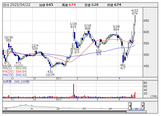 ウェーブHD <7940> 563 +22 ( +4.1%) 4,400 ( 248) 4,100 ( 230)