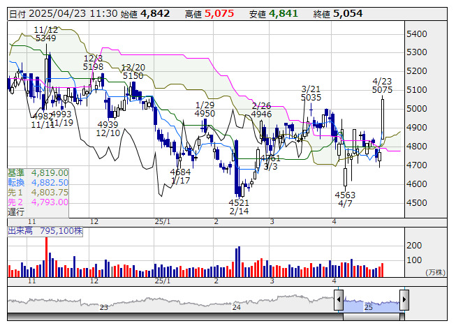 サントリBF <日足> 一目均衡表 「株探」多機能チャートより●一目均衡表【3役好転】銘柄(市場人気順) ★強い上昇トレンドに入った可能性が高い銘柄