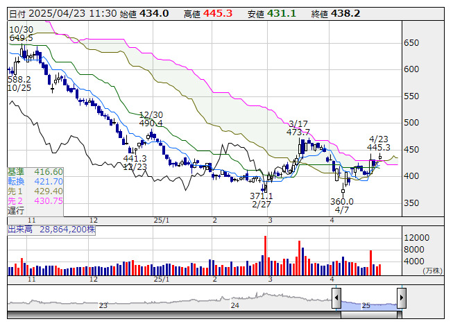 東電HD <日足> 一目均衡表 「株探」多機能チャートより●一目均衡表の【雲】上抜け銘柄(市場人気順) ★2つの先行スパンに挟まれた上値抵抗帯を上抜けた銘柄