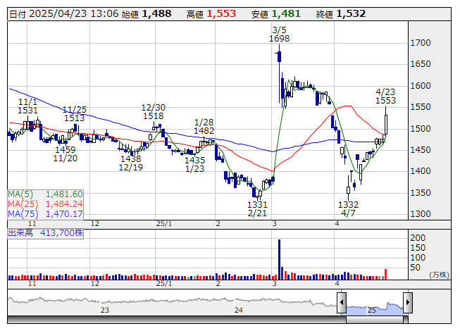 杏林製薬 <日足> 「株探」多機能チャートより